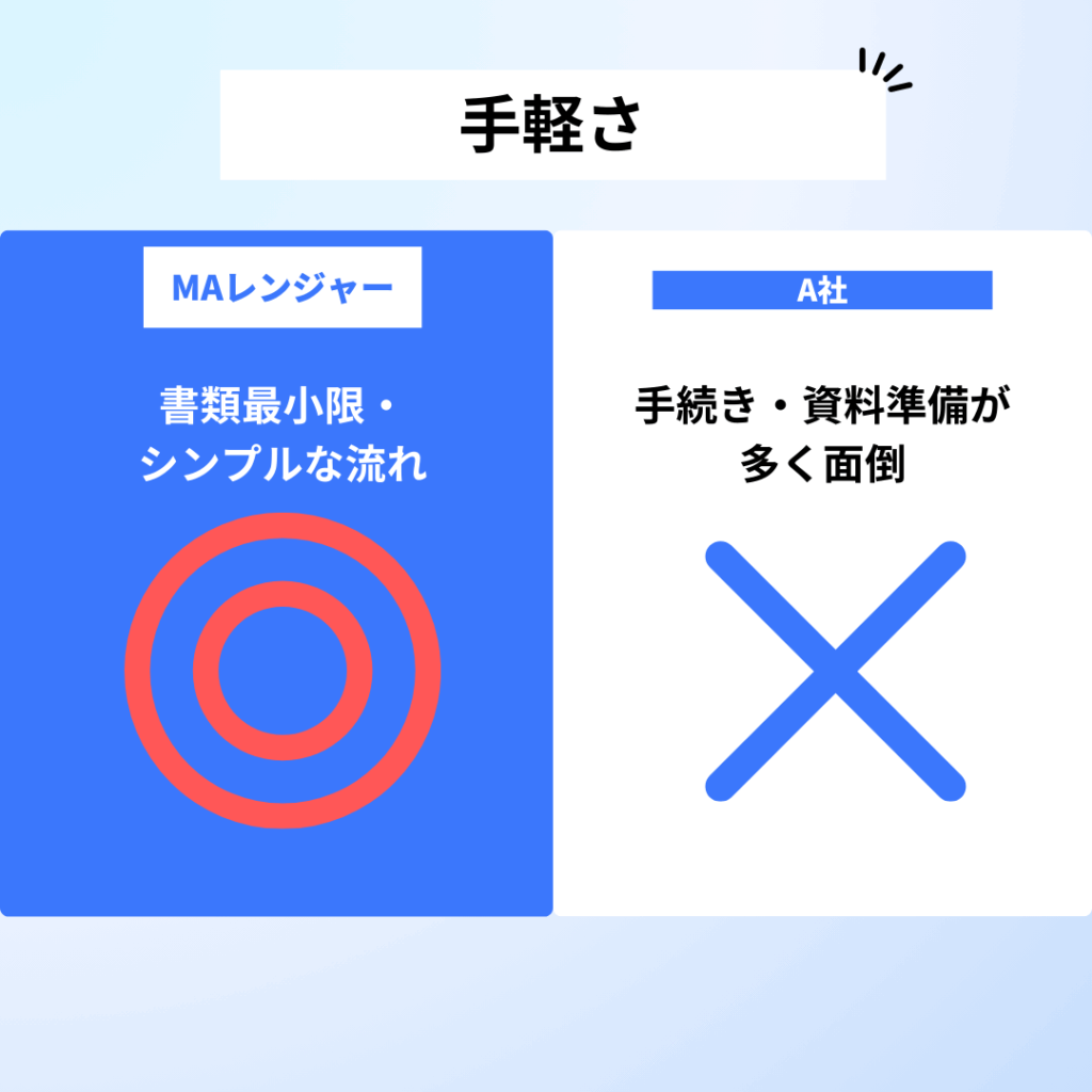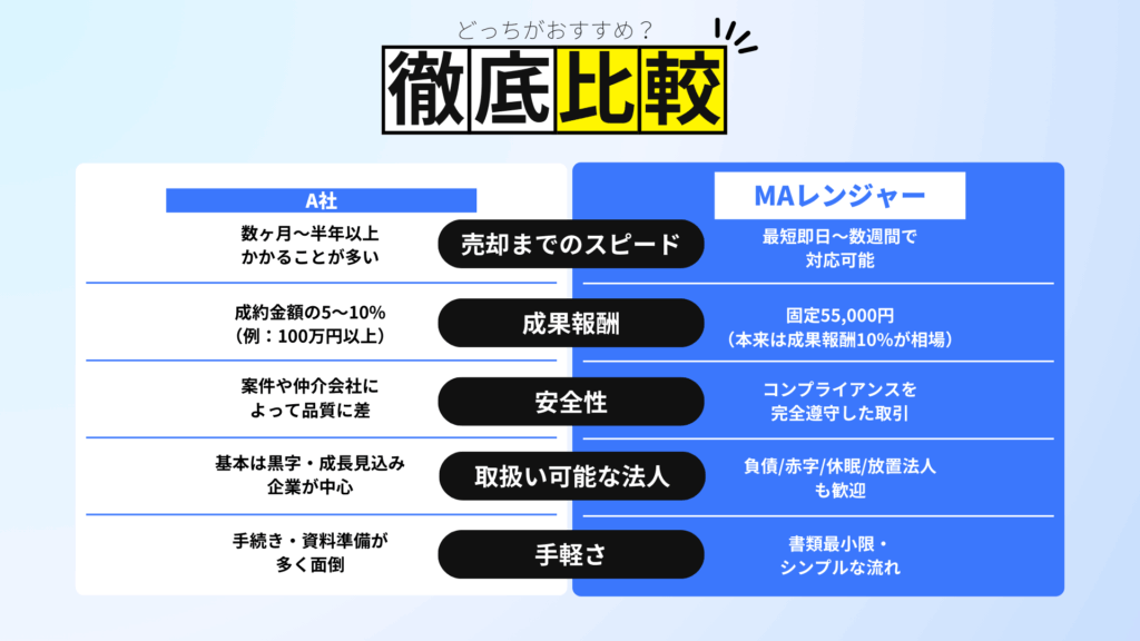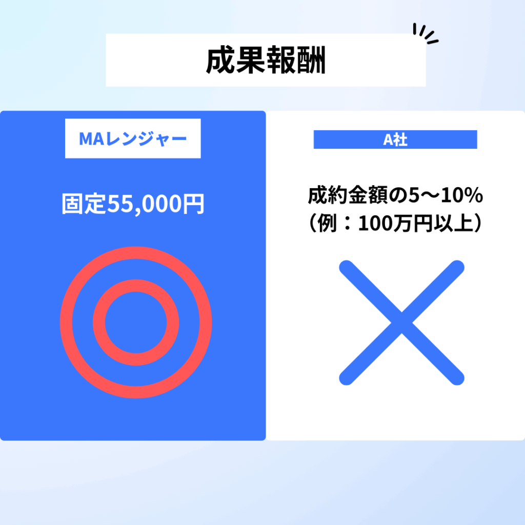 通常のM&A仲介では成果報酬10%が相場ですが、MAレンジャーは55,000円の固定料金。取引金額に関わらず費用が確定しているため、利益を最大化できます。